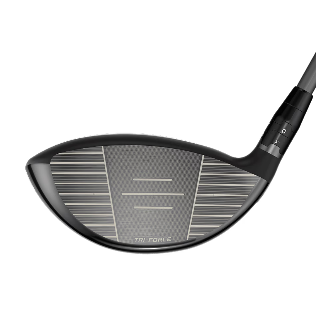 PGAツアーなどで公式に使われており、ゴルフでプレーヤーの各ショットの価値を統計的に評価するための指標である「Strokes Gained(ストロークス・ゲインド)」によると、飛距離のほうが正確性よりも重要で、ドライバーの飛距離が伸びると平均的にスコアは良くなる傾向があると言われています。これは、より短い距離からのアプローチショットほどグリーンに乗せる確率や寄せる確率が高いためです。そこで、2026年モデルのドライバーを開発するにあたり、キャロウェイが掲げたテーマは、「SPEED IS EVERYTHING = スピードがすべて」。すなわち、さらなるスピードの追求でした。実現に向けて導き出したテーマは、フェース素材のチタンを最大限に薄肉化し、優れた反発力をどこまで極限まで引き出すことができるかというものでした。チタンにポリマー素材とカーボンファイバーを重ね合わせた業界初の3層構造フェース「TRI-FORCE(トライフォース)フェース」が、従来よりも桁違いに増大したボール初速と飛距離性能を実現。“飛躍的な”という意味を持つ「QUANTUM(クアンタム)」という新シリーズが誕生しました。「QUANTUM MAX Dドライバー」はD(DRAWの頭文字)という文字からもわかるように、つかまりの良いドローバイアス仕様。QUANTUM MAXドライバー同様、カーボンクラウンとチタンソールで作られているため、低・深重心でボールが上がりやすいモデルです。AIによるフェース設計も引きつづき導入されており、コントロールポイントがさらに強化され、弾道補正効果も大きく高まっています。